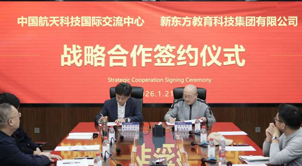 近日,中国航天科技国际交流中心与新东方教育科技集团有限公司签署战略合作协议。国际交流中心主任于淼与新东方教育科技集团副总裁柴明一,就推进落实双方战略合作进行了深入交流。