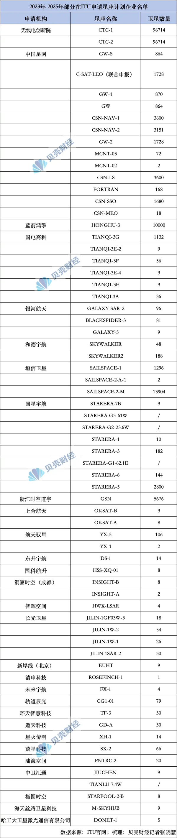 据新京报贝壳财经记者不完全梳理,目前,中国星网、上海垣信、蓝箭鸿擎、无线电创新院向ITU(国际电信联盟)提交的星座规模均达到10000颗卫星以上;2023年以来,我国共有超过60家机构向ITU申报卫星资料,行业覆盖范围极其广泛,既有中国星网、上海垣信、中国卫通等央国资背景企业,也有清华大学、北京大学、中科院、鹏城国家实验室等科研力量,还有蓝箭鸿擎、银河航天、长光卫星、国星宇航等庞大的商业航天队伍。