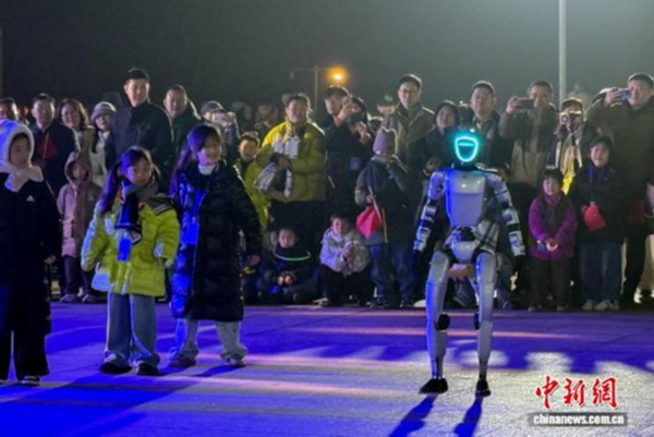 3月22日晚,山东海阳连理岛,游客在火箭发射前观看机器人表演。中新社记者 王娇妮 摄