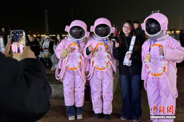 3月22日晚,山东海阳连理岛,游客与身着“航天服”的工作人员互动。中新社记者 王娇妮 摄