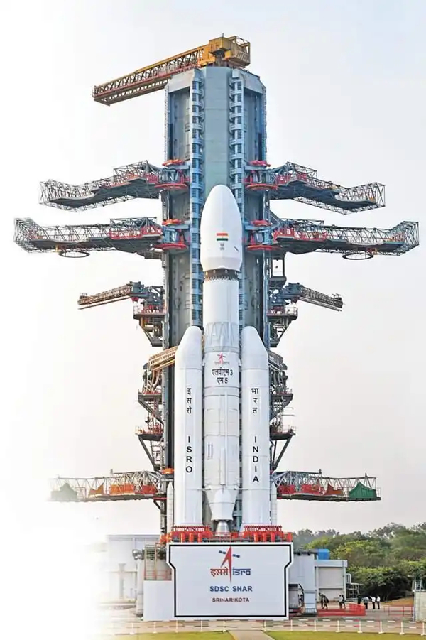 发射塔架上整装待发的LVM3火箭。