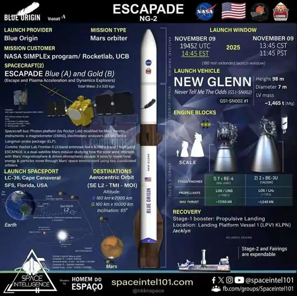 2025年11月,蓝色起源旗下的新格伦火箭将进行第二次试飞,虽然它于11月9日的发射因天气原因已经推迟,但择机还会再发射。如今这款火箭承载着NASA ESCAPADE火星探测任务的期待,这场任务不仅是新格伦火箭验证自身可靠性的关键之战,更开创了行星探测“发射后待命”的全新模式——两台火星探测器将在拉格朗日L2点停留整整一年,打破传统火星任务26个月一次发射窗口的限制,为低成本深空探索写下新的注脚。