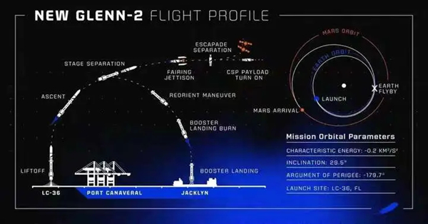 这两颗火星探测器发射的具体执行流程将分为三步:第一步,新格伦火箭将探测器送入地球逃逸轨道;第二步,探测器自主点火前往L2点,进入晕轨道待命;第三步,2026年11月借助地球“引力弹弓”效应助推,加速并调整轨迹,帮助探测器在2027年9月抵达火星轨道。