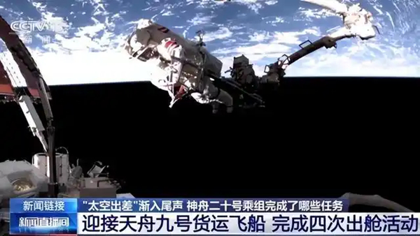 在轨期间,神舟二十号航天员乘组还完成了四次出舱活动。四次出舱任务中,乘组不但完成了空间碎片防护装置的安装,同时开展舱外设备设施巡检及处置等任务。