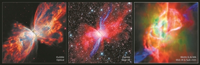 英国卡迪夫大学团队利用詹姆斯·韦布空间望远镜(JWST)对蝴蝶星云(NGC6302)进行观测,揭示了其核心区域复杂的宇宙尘埃结构。相关论文