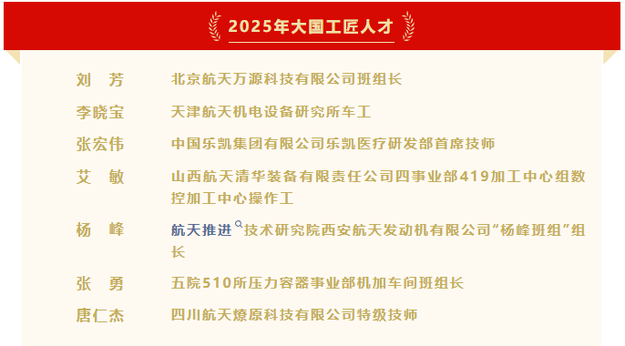 近日,中华全国总工会发布2025年大国工匠人才认定结果,在全国认定200名2025年大国工匠人才,中国航天科技集团有限公司7人上榜。中华