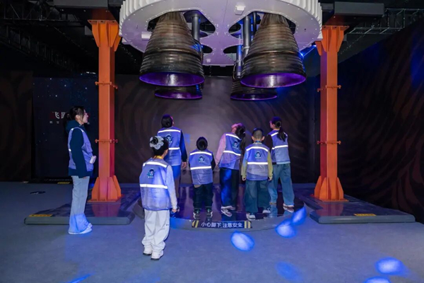 火箭展区内,来自市第八十七中学研学团的同学们排起了长队,眼神中满是期待。这里不仅有长征系列运载火箭家族模型,还有极具视觉冲击力的火箭发动机喷口巨型艺术装置,而最受欢迎的当属“火箭森林”互动装置,随着“3、2、1”的倒计时声响起,一名三年级同学用力触摸屏幕上的点燃键,大屏幕同步闪现火箭拔地而起的震撼画面,烈焰冲天、轰鸣阵阵,让他忍不住欢呼:“太酷了,我好想成为一名航天员呀。”亲身参与的体验,让航天梦在孩子们心中悄然扎根。