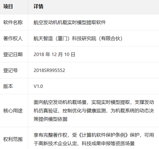 航空发动机被誉为“工业皇冠上的明珠”,其机载运行的动态控制与健康管理,是保障飞行安全、提升动力性能的核心环节。近日,航天智造(厦门)科技研究院传来捷报,成功斩获“航空发动机机载实时模型提取软件(软著登记号:2018SR995552)”软件著作权,以硬核技术突破,为航空动力系统数字化升级注入新动能,也彰显了这家新锐科研机构在航天技术民用转化领域的坚实步伐。