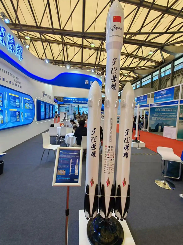 星际荣耀在上海商业航天展览会上展出的“双曲线三号中大型可重复使用液体运载火箭”模型 财联社记者摄