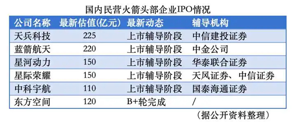 根据最新统计,国内已有过火箭入轨纪录的商业火箭公司中,除东方空间外,其余五家企业均已启动IPO冲刺,这些公司的总估值超过855亿元。